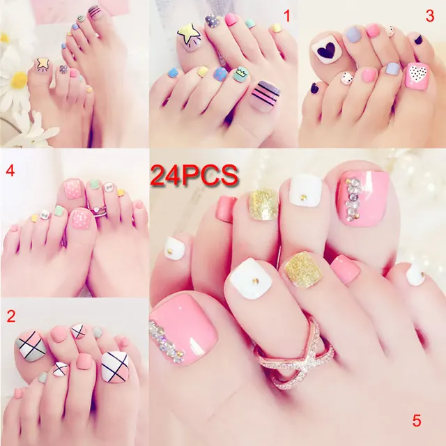 Us 1 61 20 Off 24 Pcs Set Lady Girl 3d Toe Fake Nails Full Foot Toes Nail Art Tips False Nails With Glue Fresh Summer Style In False Nails From