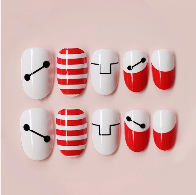 Baymax Style Black White Red False Nails 24 Pcs Glue On Fingernails