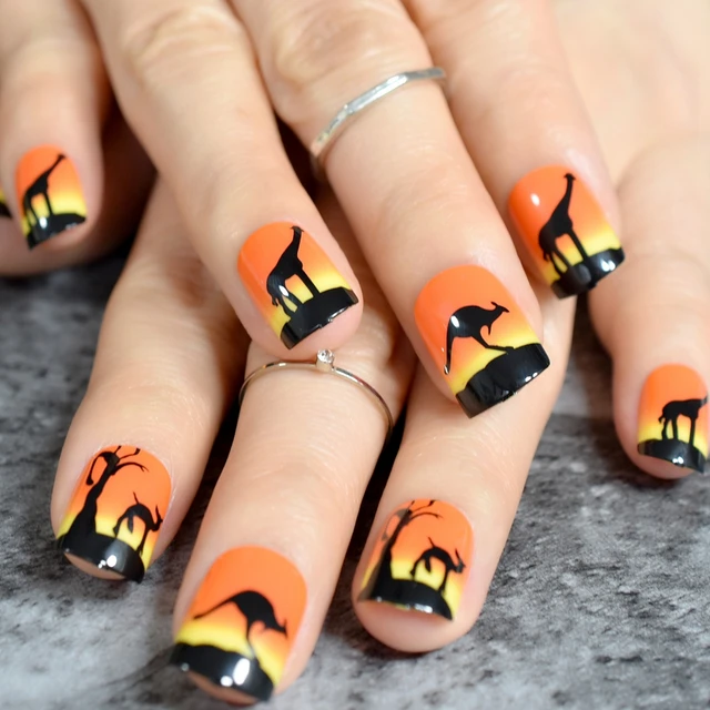 Animal Drawing Black French Nail Orange Zoo Harajuku Style Square