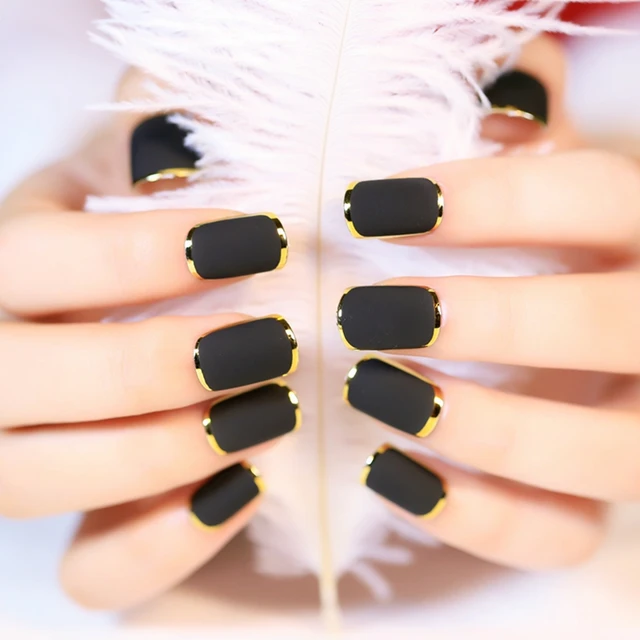 Phnom Matte Fake Nails 1 Set 24pcs Elegant Black Gold Line Nail Art