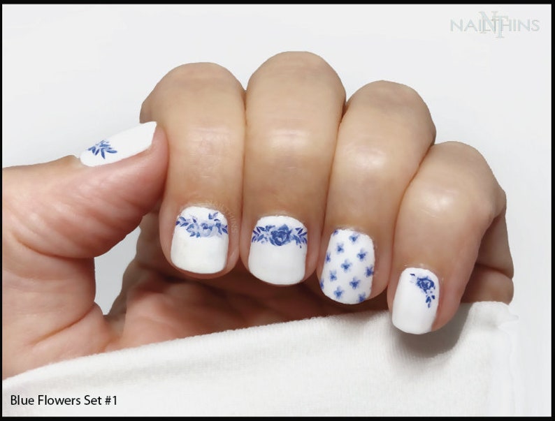 Flower Nail Wraps Blue Flower Nail Decals Delft Blue Flowers Etsy