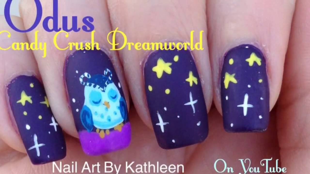 Odus Candy Crush Dreamworld Owl Freehand Nail Art Tutorial Youtube