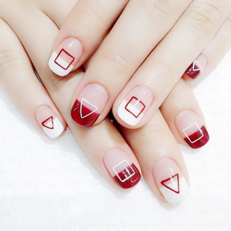 Korean Red Geometry Pattern False Nails 24pcs With Glue Short Size