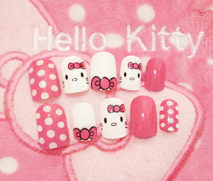 Popular Cute Pink Fake Nails Hello Kitty Short Candy Spots Strip