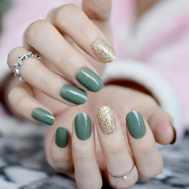 28pcs Dark Green Artificial Nail Tips Gold Glitter Decoration Short