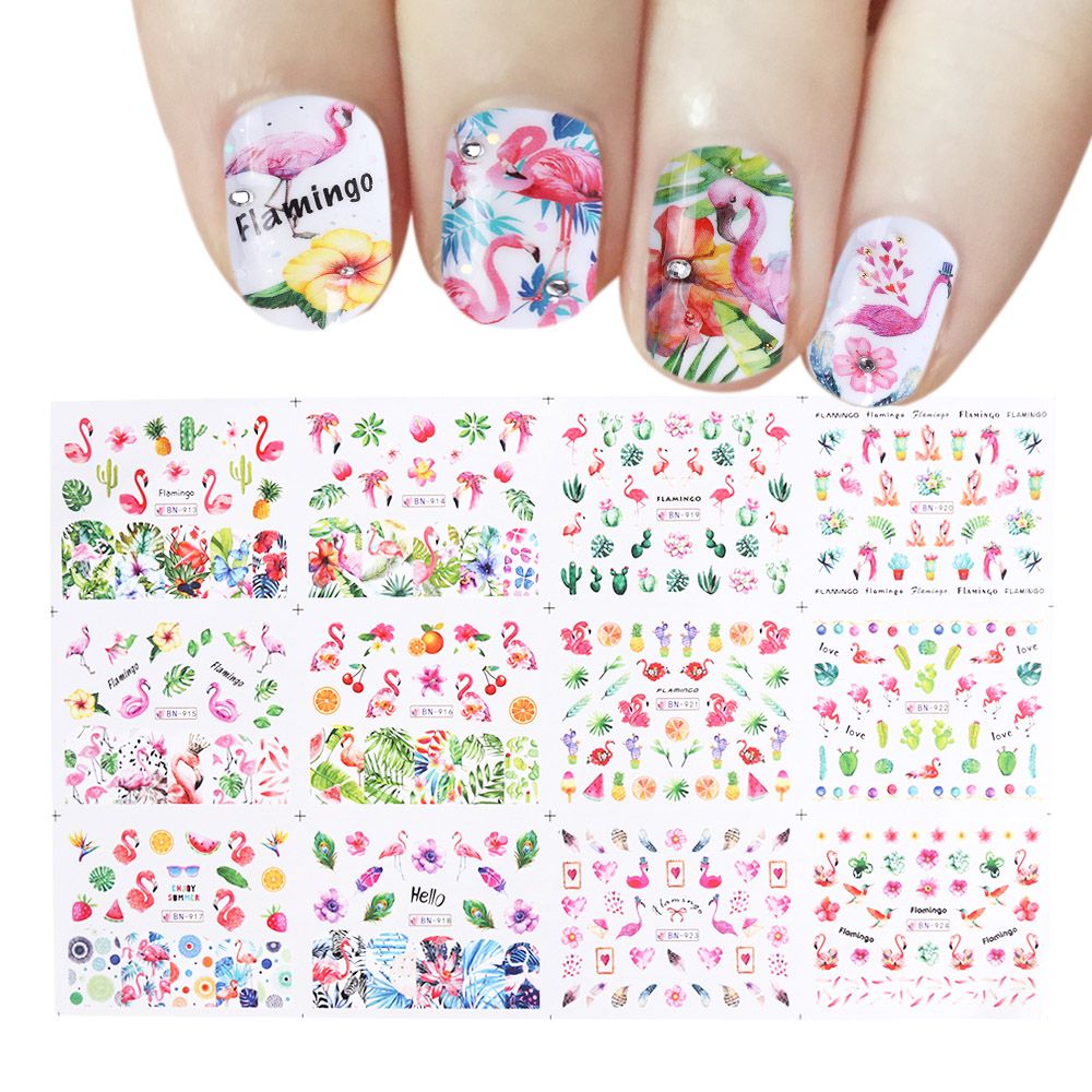 12 Designs Flamingos Nail Art Sticker Flower Green Leaves Water Decals New Design Nails Decorations Manicure Tools Labn913 924