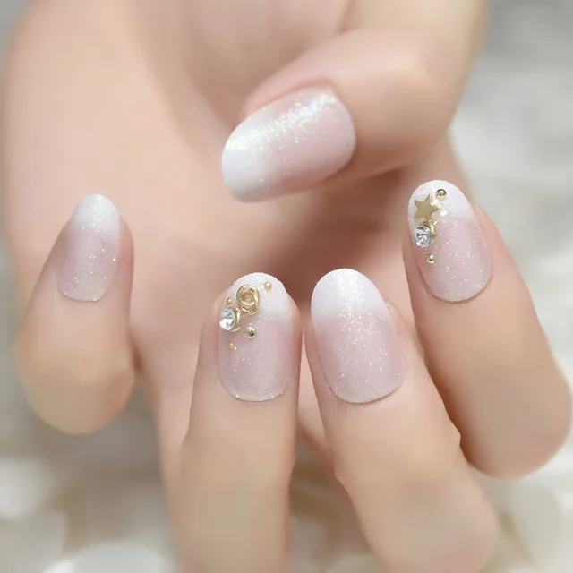 Us 2 54 Sparkly 3d Rivet French Nail Art Decoration With Glitter Oval Short Full False Fake Nails For Home Office With Glue Sticker Z941 In False