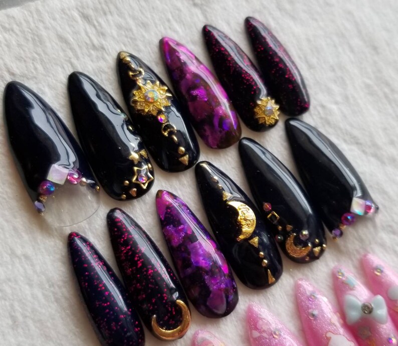 Long Stiletto Talons Gyaru Black Fuschia Glitter Gel Nail Etsy