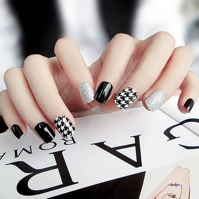 Girls Simple Color False Nails Houndstooth Pattern Silver Glitter