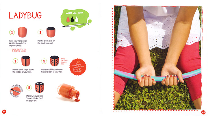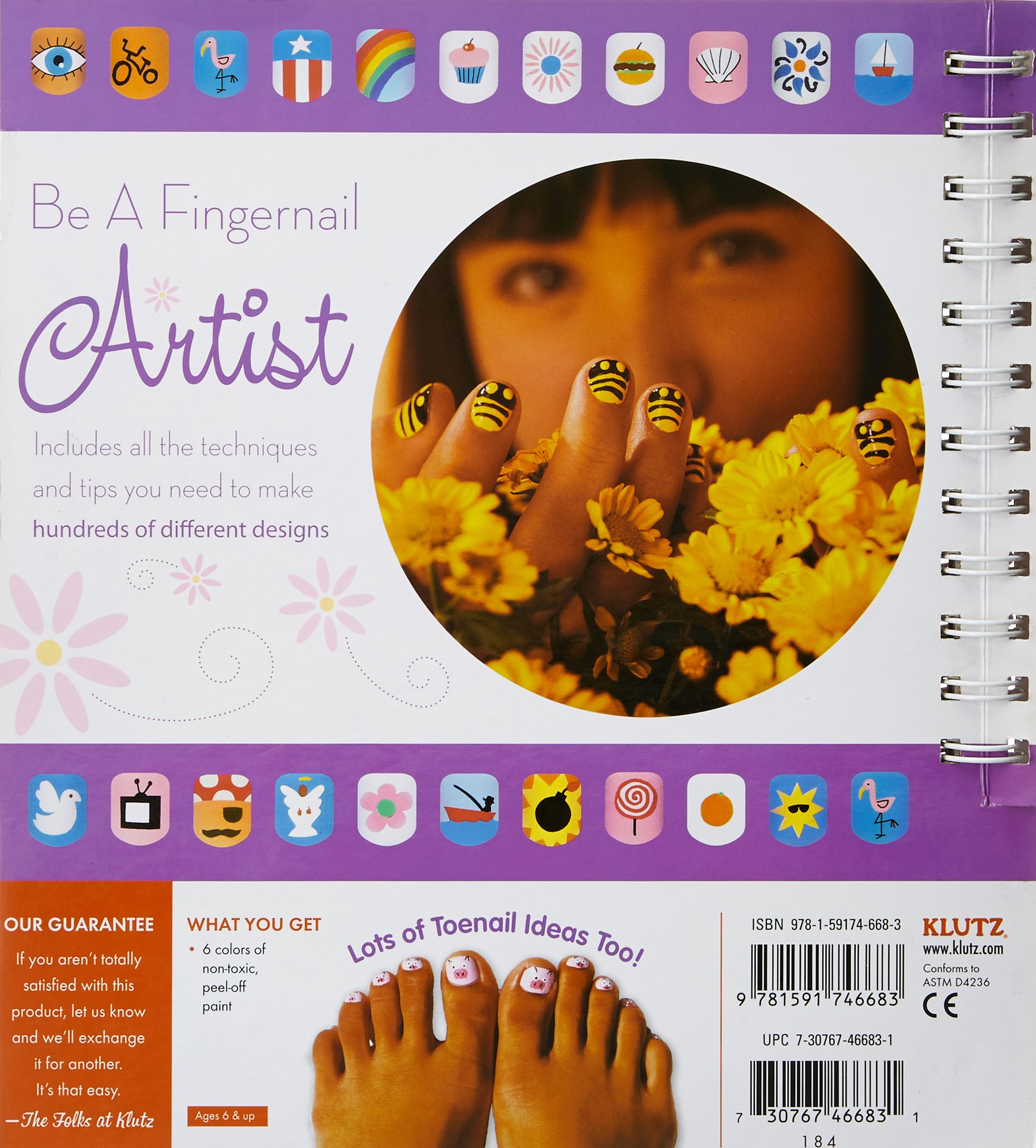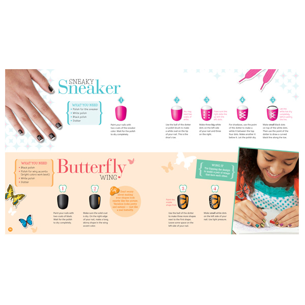 Klutz nail art book. This book has had a complete makeover with new photography layout and design along with all new projects we kept a few from the original new polish colors and a detailing nail art brush. In order to navigate out of this carousel please use your heading shortcut key to navigate to the next or previous heading. Filled with hundreds of designs and printed in klutzs trademarked wire bound oversized cardstock format this book comes packaged with a palette of six water based non toxic nail paints. The included custom two sided dotting tool makes dots and lines a breeze and stick on peel off stencils make geometric shapes crisp and stylish.