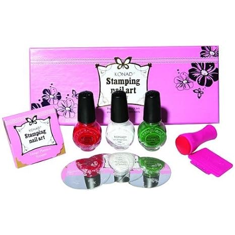 Konad stamping nail art b set. Free storage and display caseholder is included in each order. Image plate m3 m39 m82 m100 maximum 7 designs on 1 image plate nail polish white red blue 11ml stamp scrapper. Konad stamping nail art is a new nail imprinting kit that lets you put designs by stamping pre designed images on your nails in seconds. You can start creating beautiful nails right away with any of these kits.