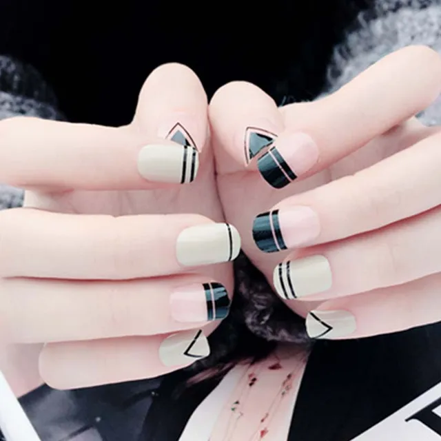 24pcs Girls Strip Printing Fake Nails Diy Short Size Nails Art Tips