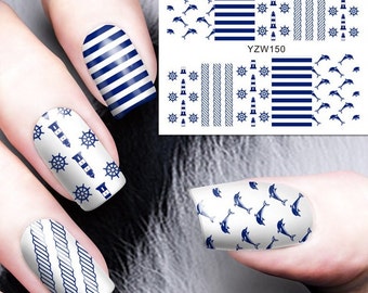 Nautical Nail Art Dolphins Lighthouse Blue Stripes Water Full Wraps