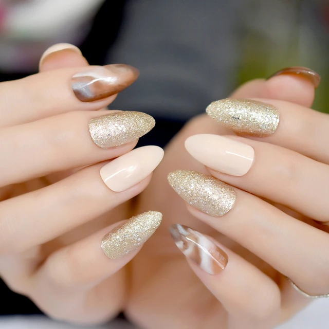 Brown Marble Acrylic Nails Gold Glitter Medium Sharp Stiletto False