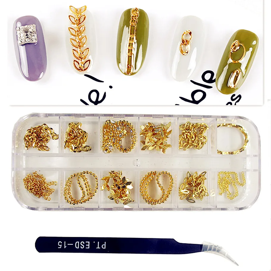 12 Shapes 3d Gold Metal Nail Art Decorations Circular Frame Box