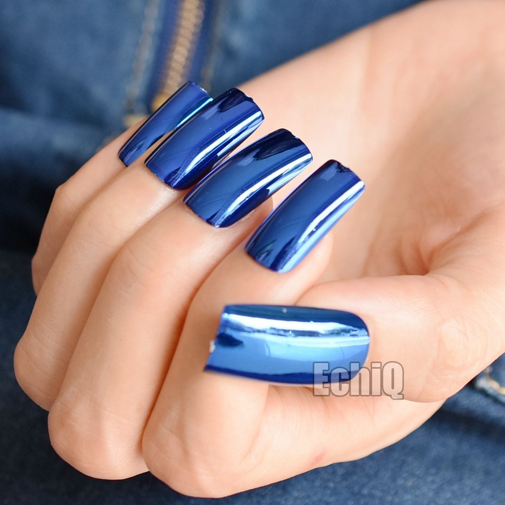 Kit Mirror Acrylic Fake Nails Deep Blue Metallic False Nail Extra