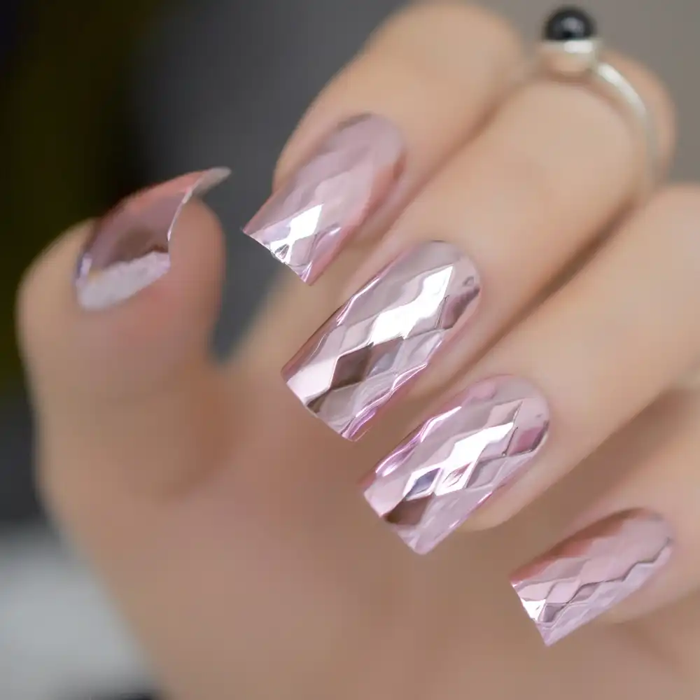 Rhombus Metallic Nail Art Tips Pink Square Head Mirror False Nails