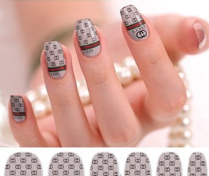 Self adhesive strips of designer fabric nail covers can be applied to entire nail or cut pieces to create a unique affect.