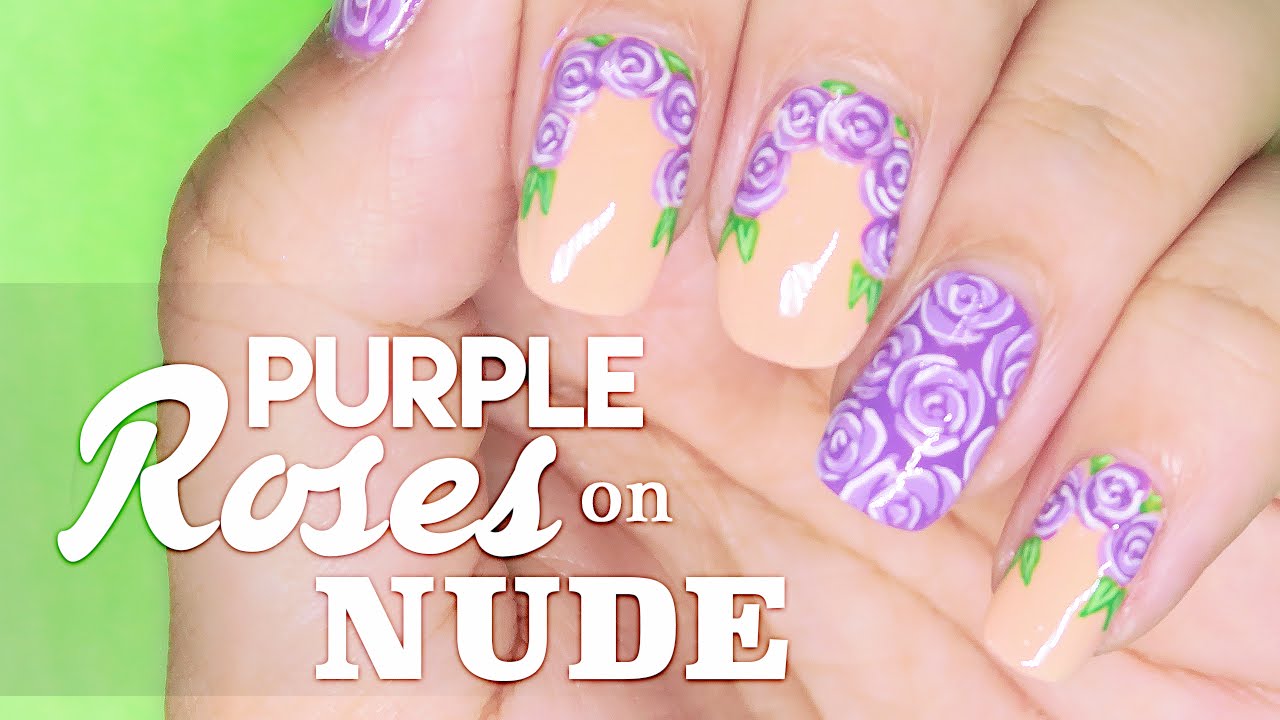 Purple Roses On Nude Nail Art Tutorial Romantic Floral Nail Art
