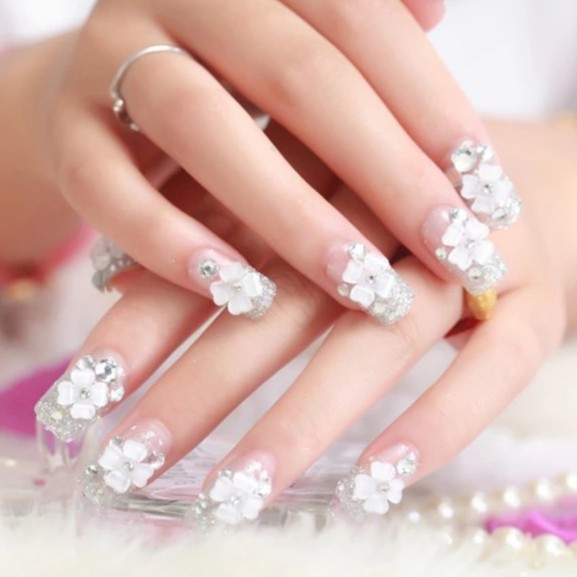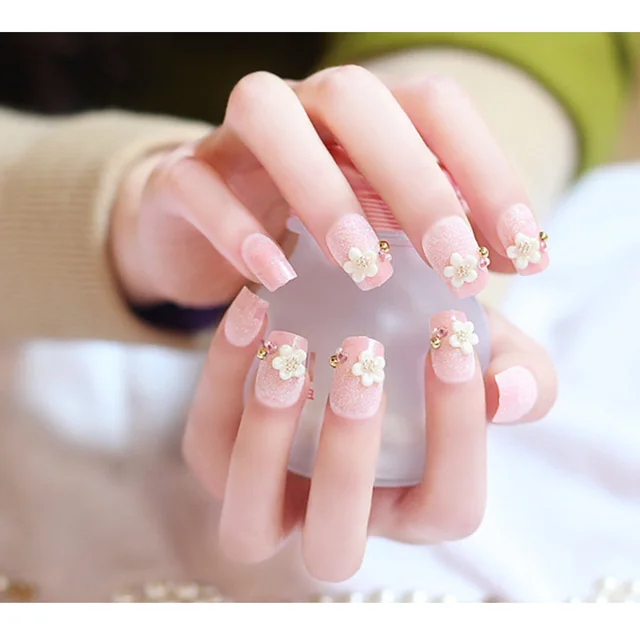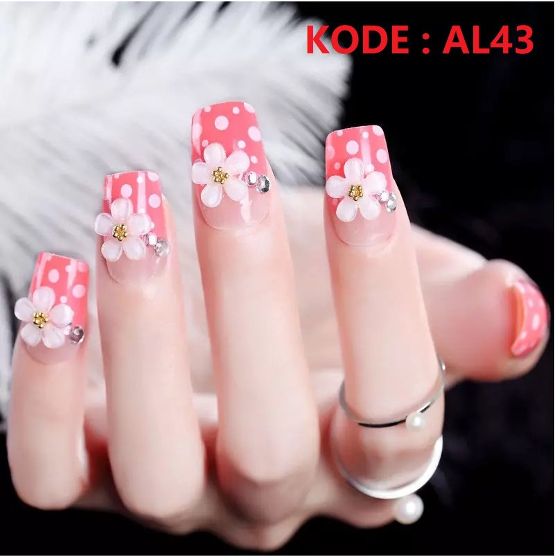 Jual Nail Art 24 Pcs Kuku Palsu Pink Dengan Accesoris Bunga Putih