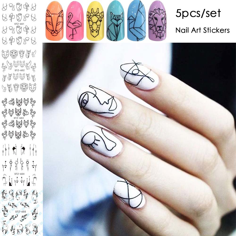 Lookathot 5 Sheets Black Simple Line Nail Art Stickers Character Animal Pattern Foil Paper Printing