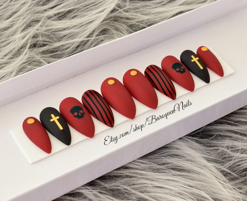 Skull Burgundy Press On Nails Gold Cross Alternative Nail Etsy