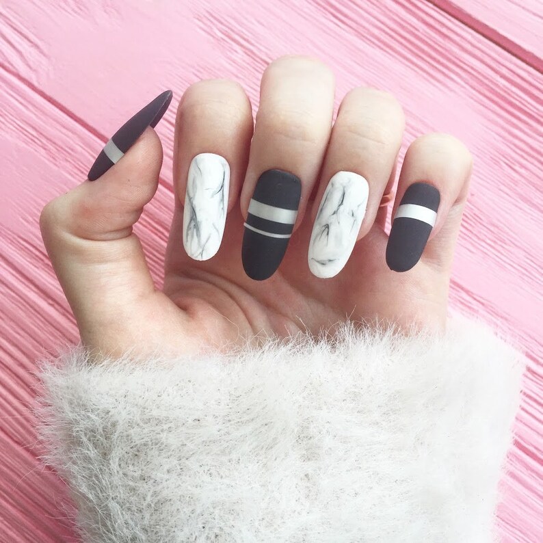 White And Black Nails Matt Nailsmarble Nails Fake Nails Etsy