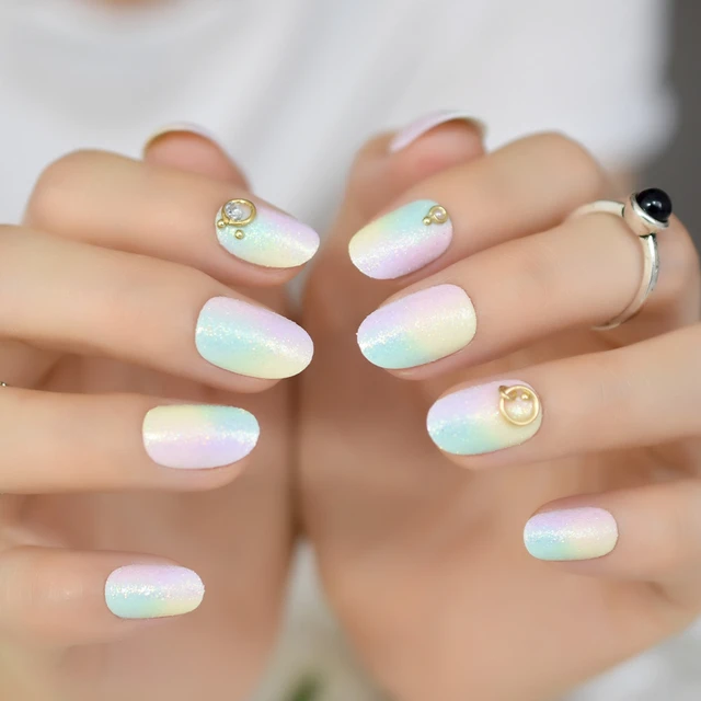 24pcs Kit Rainbow Glitter Acrylic Nail Art Tips Colorful Oval Medium