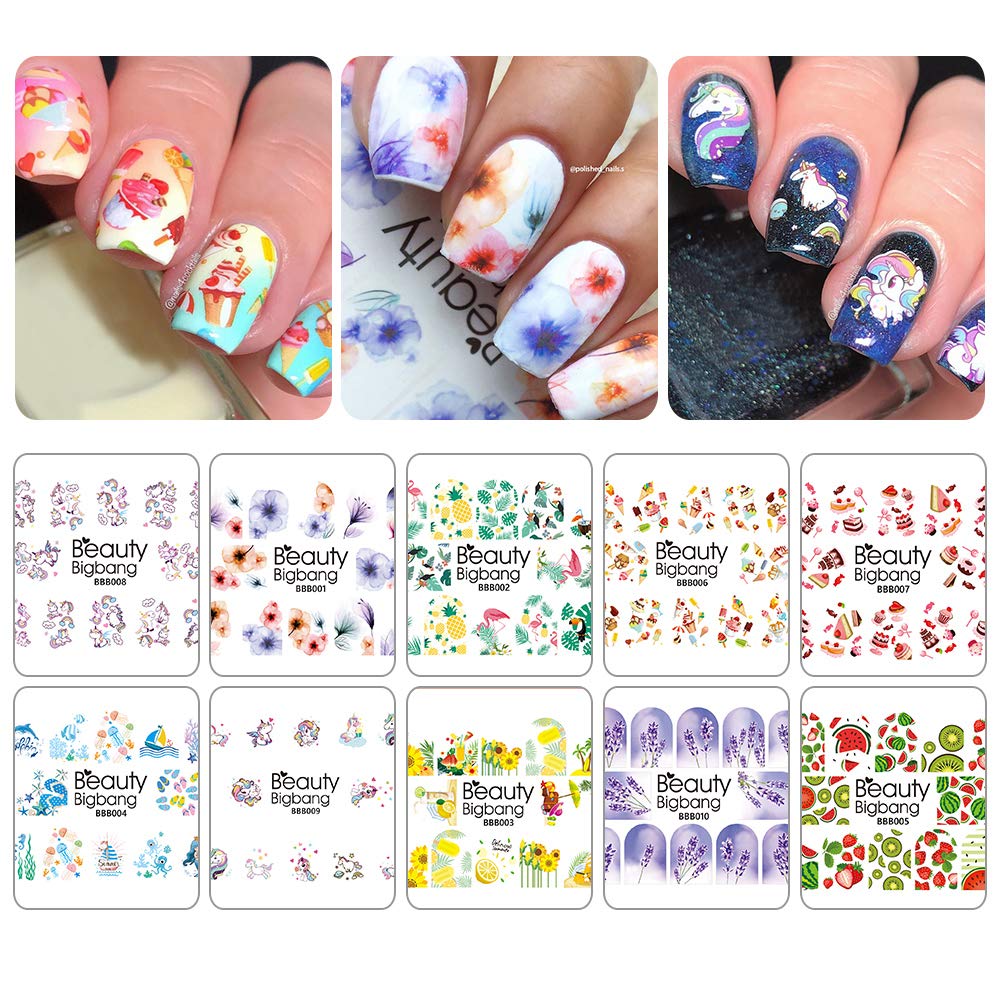 Beautybigbang 10 Sheets Nail Art Stickers Water Transfer Decals Nail Art Tattoos Diy