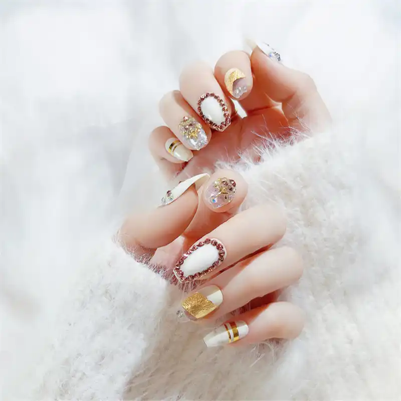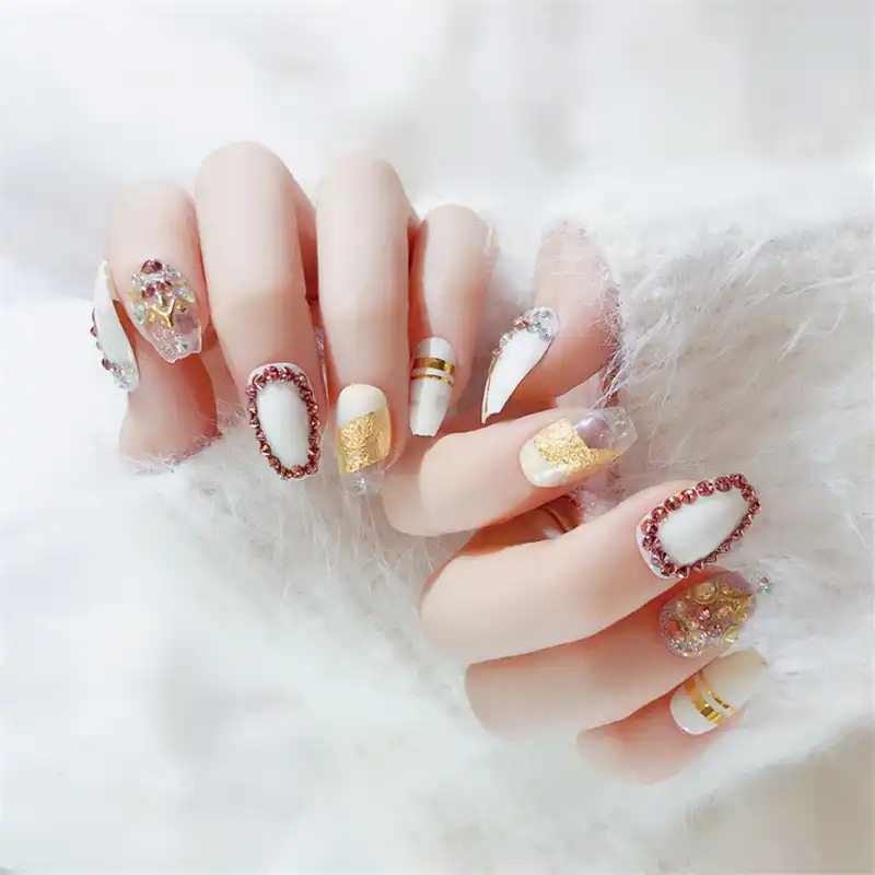 3d Fake Nails Marble French Acrylic Nails Glittering Diamond False
