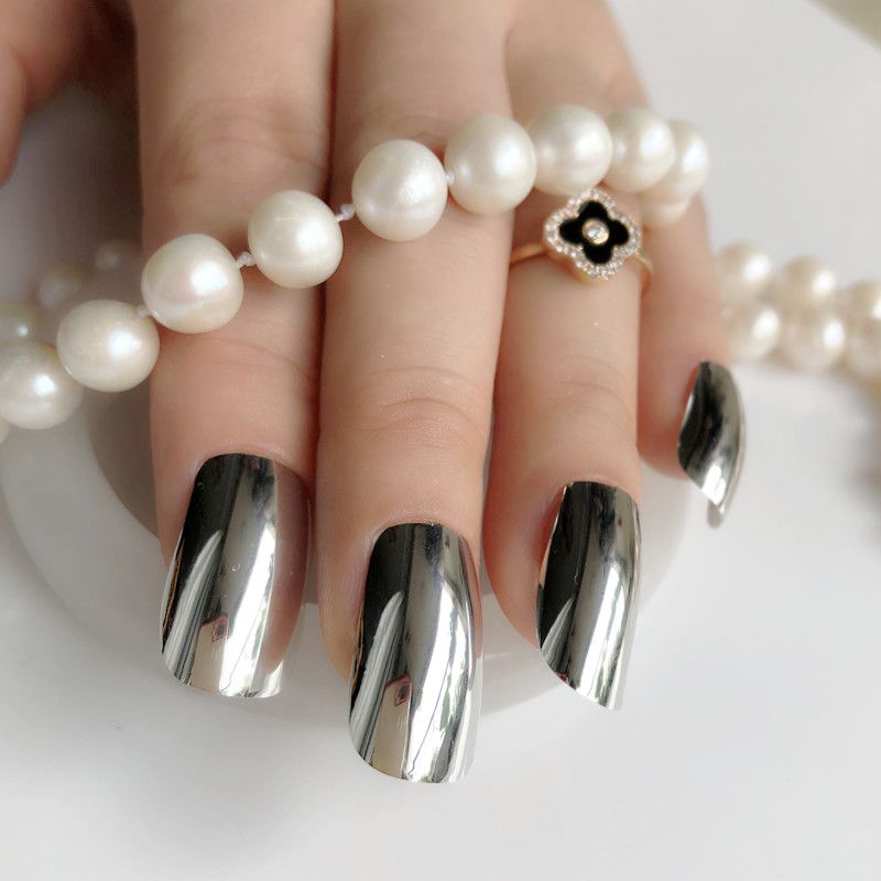 Long Square Flat Head Press On Nails Silver Mirror Metal False Nails Beautiful Shining Sexy Design Supplies