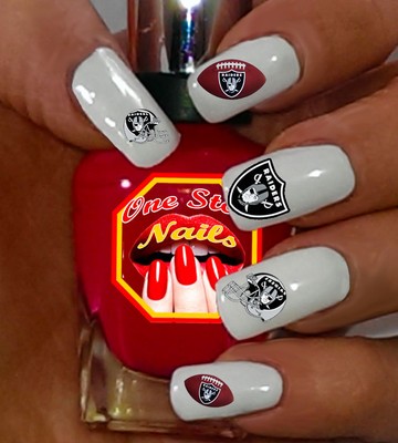 Oakland raiders nail art waterslide nail decals set of nfl or 001 56. 99 025ounce 300 shipping. Ladies now your nails can show off you team spirit with this raiders finger nail tattoos these miniature decals give your nails that extra team flair wherever you go. No portion of this site may be reproduced without the express written permission of the oakland raiders.