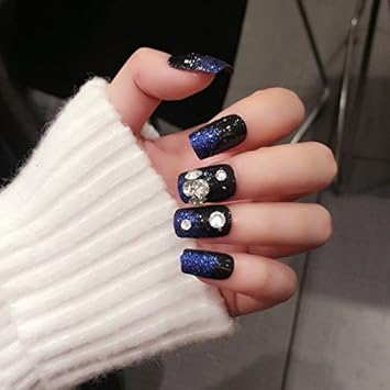 Amazon Com Black Square Press On Nails Blue Glitter Designed Uv
