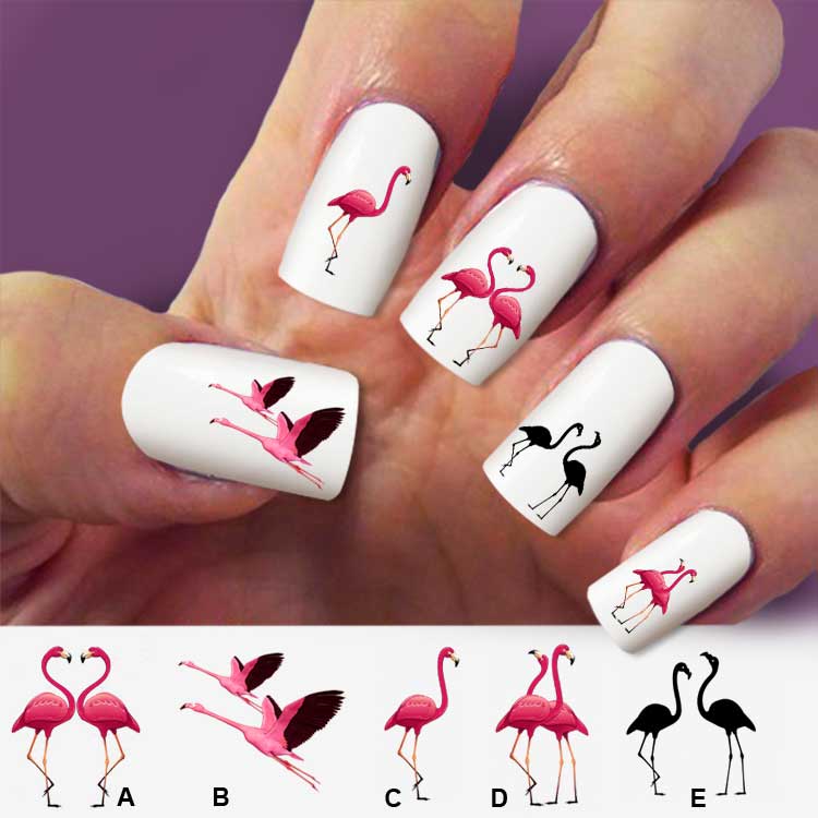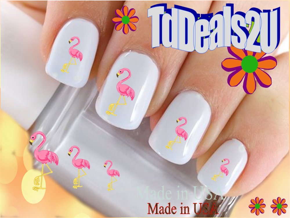 Paint over the flamingos with pink polish. And the symbol of this summer was flamingo a pink color bird one of the most fashionable colors of the summer of. Give the polish a minute or two to dry before you remove the tape and reveal your pink flamingo nail art. Flamingo water slide nail art decals nail salon quality.