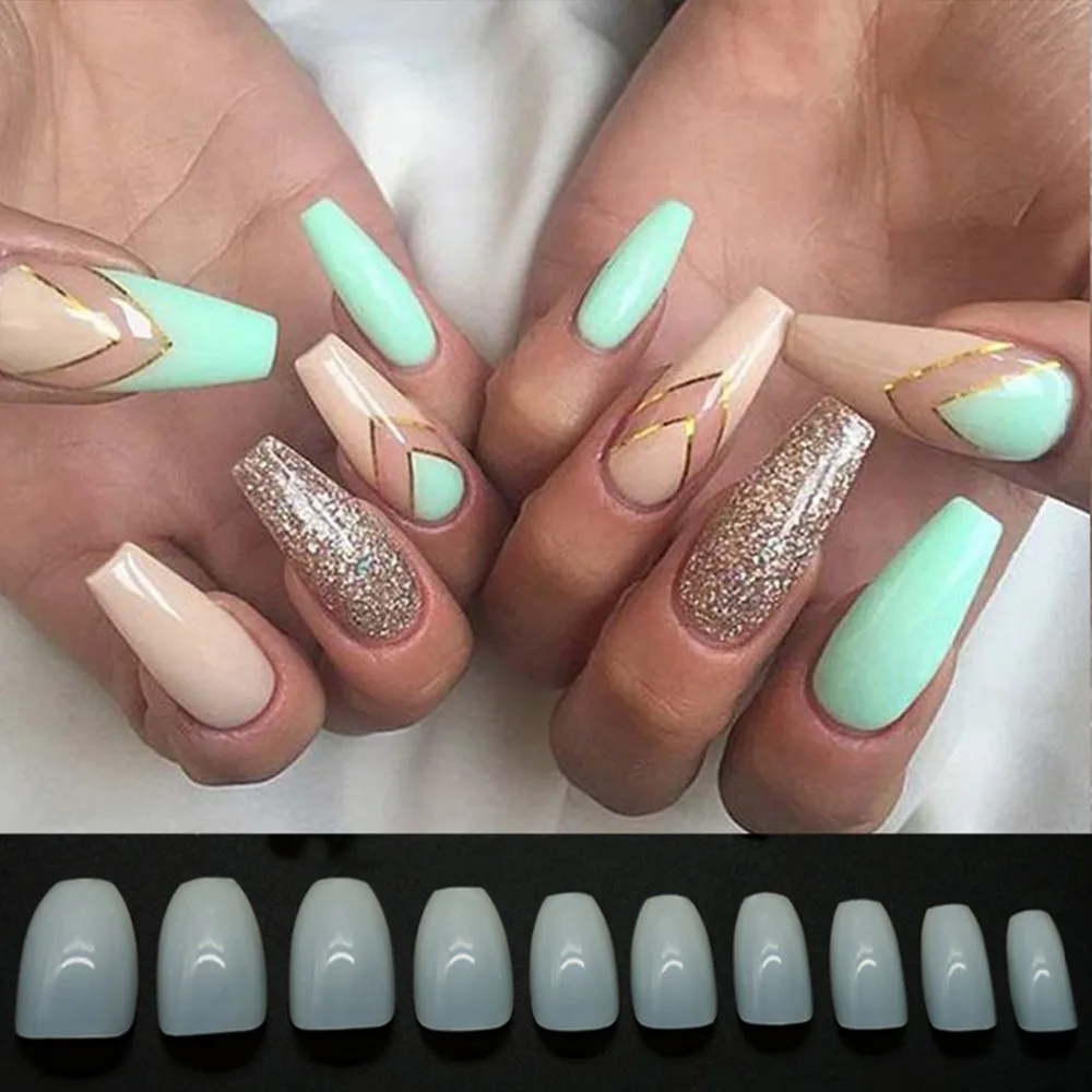 Plastic Nail Art Tips Shiny Green Acrylic Nails Fashion Glitter Fake