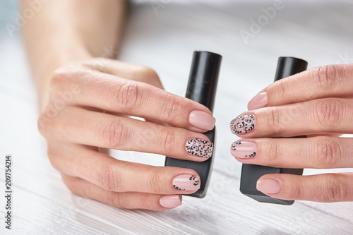 Perfect Beige Manicure With Black Lace Caucasian Womans Hands With