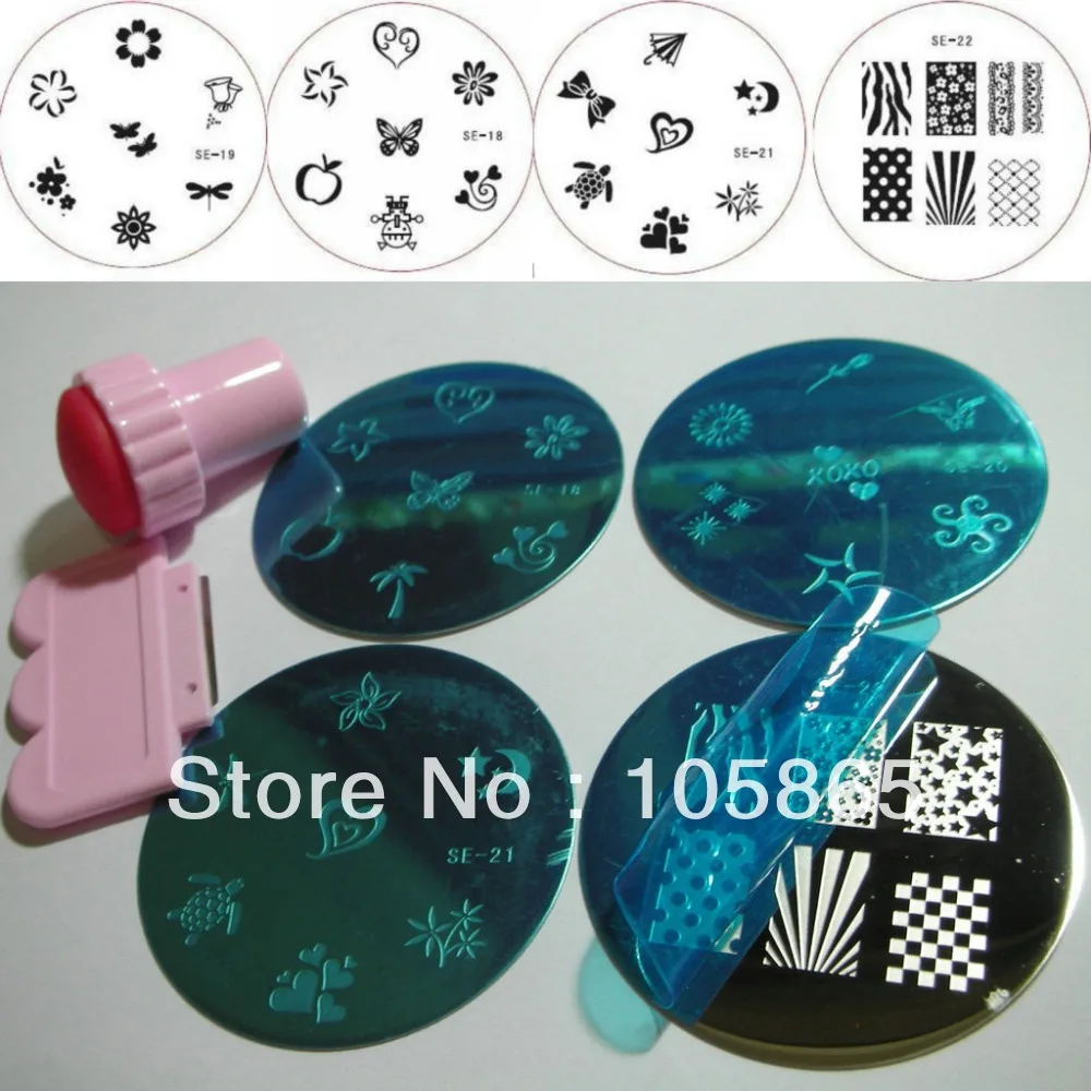 4pcs Nail Stamping Plate 1set Stamp Scraper Salon Express Nail