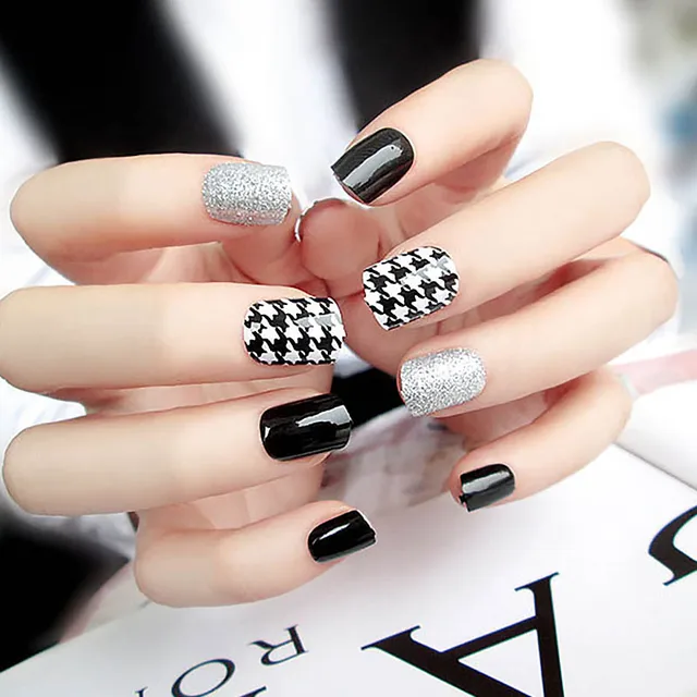 Diy Short Size Design Nail Art Tips With Glue Sexy Houndstooth