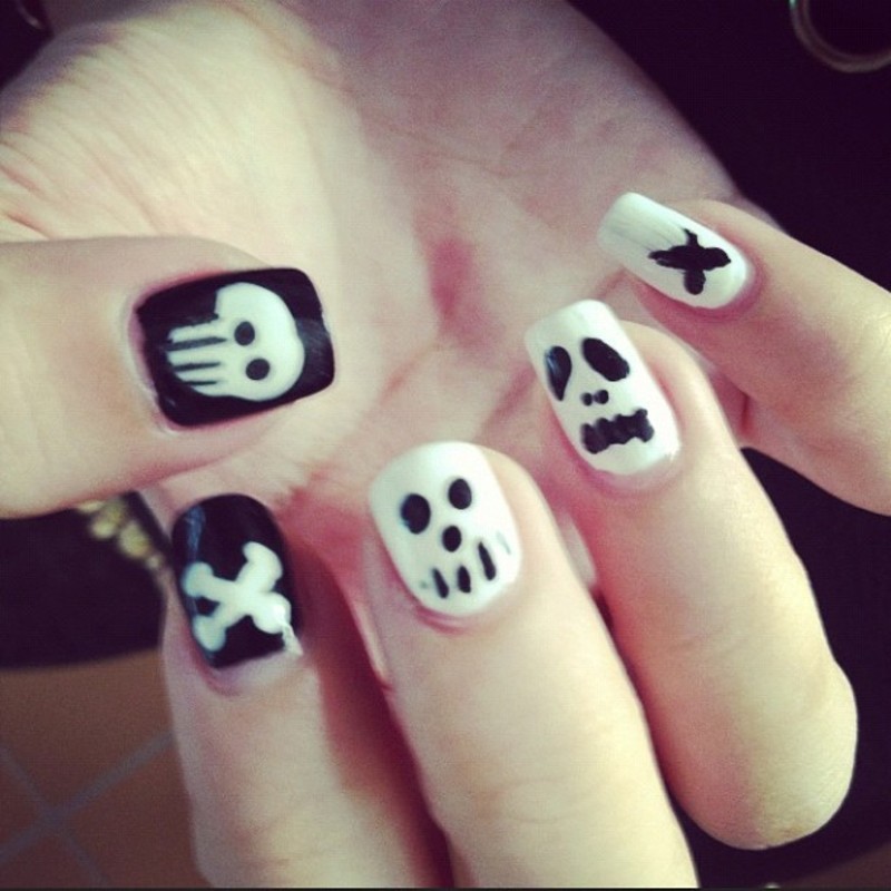 Skull and bones nail art. Watch more diy nail art videos. Select a design and peel off by your nail. Heres another spooky nail art. Creative skull nail designs.