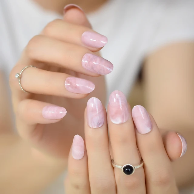 Pink Marble Pattern False Fake Nails Tips Soft Pink Oval Round Abs