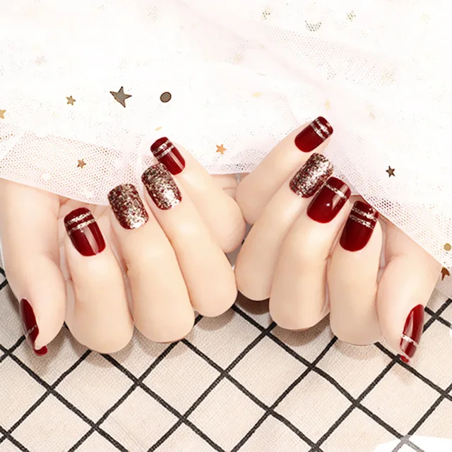 Squoval Short Size Fake Nails Sequin Diy Nail Art Wine Red Champagne