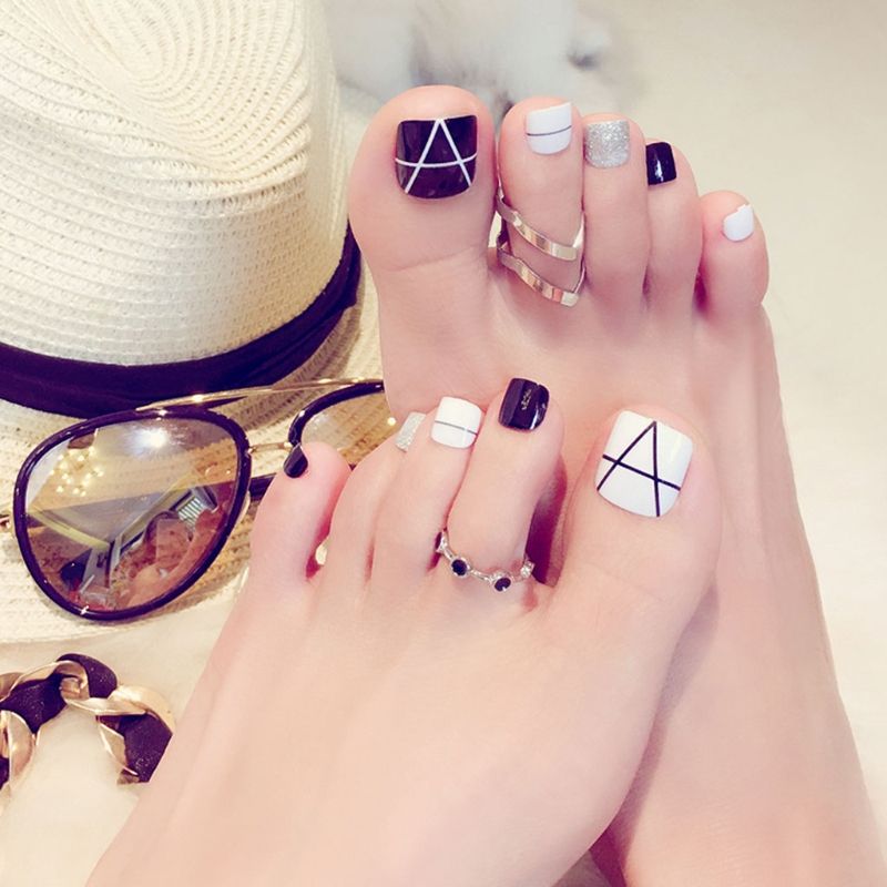 Fashion 24pcs Shiny Toe Nails With Glue Black White Geometric