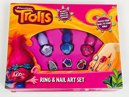 1 nail varnish. Get creative and have lots of fun with this trolls ring and nail art set. Give yourself a fab makeover with the dreamworks trolls nail and ring set. 4 nail polishes 6 rings 1 sheet of stick on earrings 2 sheets of nail stickers 1 sponge applicator 4 sponges and instructions.