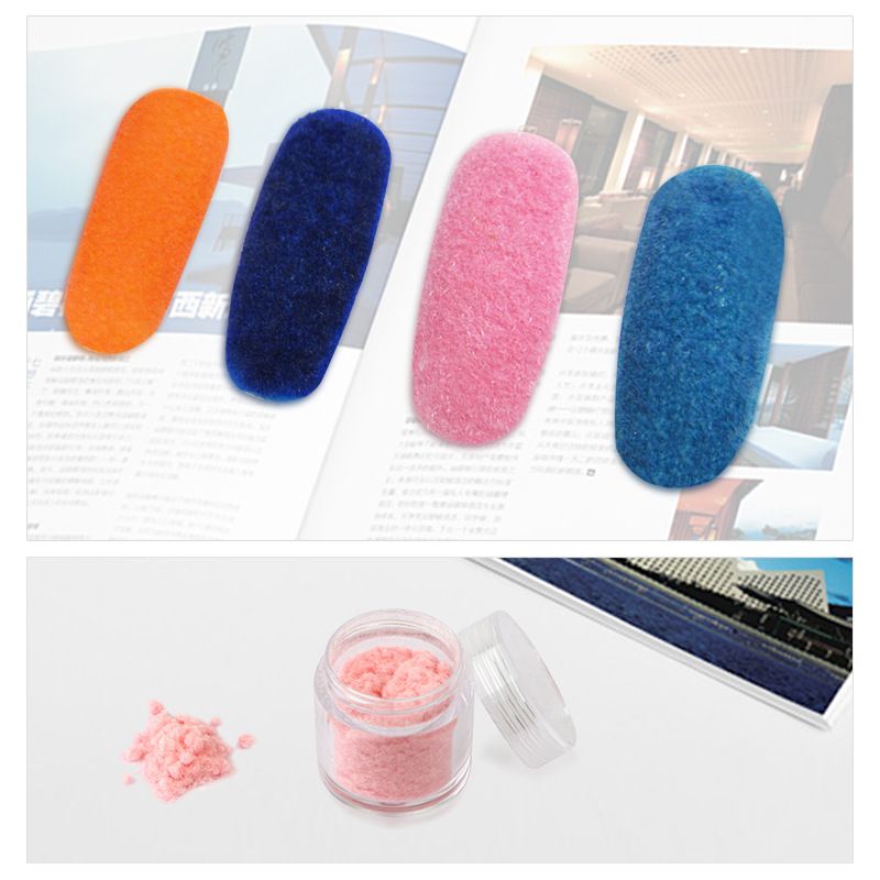 Velvet effect nail art. With this product millions of color fibers rest on the nails turning them into soft velvety landscapes. Layla s velvet effect nail art powder is a new velvet textured nail color that can be used with any nail polish and will turn your client s manicure from boring to beautiful. 12 color nail art velvet flocking powder kit decoration polish tips manicure see more like this. Use your imagination and do what you want.