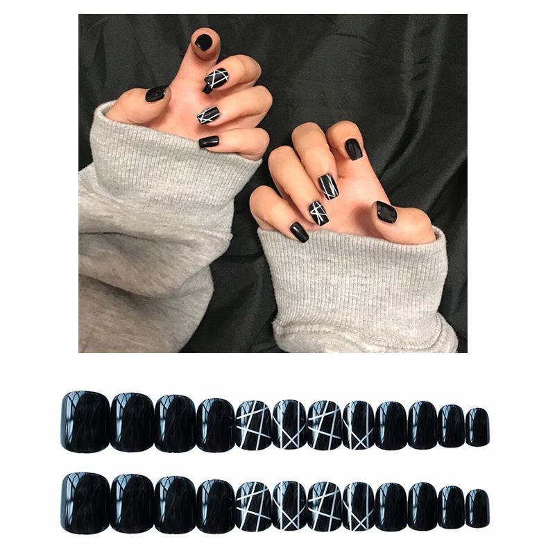 Punk Black False Nails Simple White Line Pre Design Short Full Cover