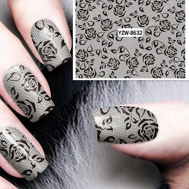 Black White Lace Flower Water Decals Transfer Nail Art Stickers