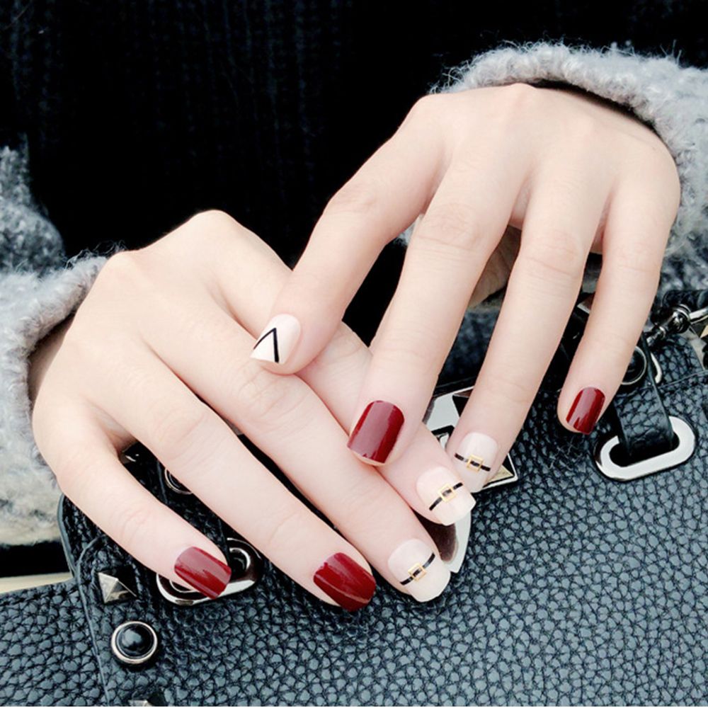 24pcs Set Elegant Wine Nail Art Tips Mixed Color Short Design False Nails Full Cover Girls Fake Nails With Glue Press On