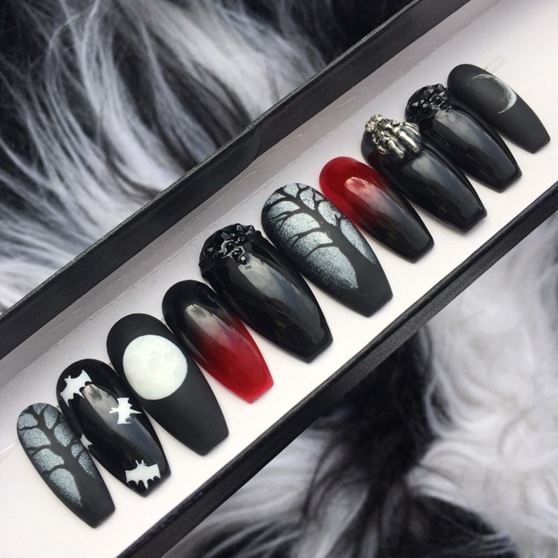 Witch Goth Press On Nails Occult Skeleton Moon Phase Etsy