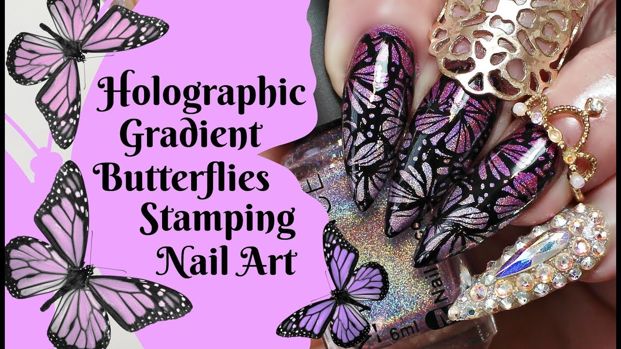 Nail Art Tutorial Holographic Gradient Butterflies Stamping Design